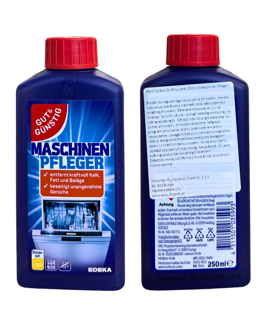 Aby Twoja zmywarka pracowała bezawaryjnie przez lata, potrzebuje profesjonalnej pielęgnacji prosto z Niemiec. Gut & Günstig Maschinen Pfleger to specjalistyczny płyn, który dociera tam, gdzie Ty nie sięgasz: do filtrów, ramion natryskowych oraz wewnętrznych rur. Regularne stosowanie (zalecane raz na 1-2 miesiące) skutecznie eliminuje osady z tłuszczu i kamienia, które są główną przyczyną awarii i nieprzyjemnych zapachów. Produkt działa podczas pustego cyklu, przywracając Twojej zmywarce fabryczną czystość i świeży, cytrynowy aromat.